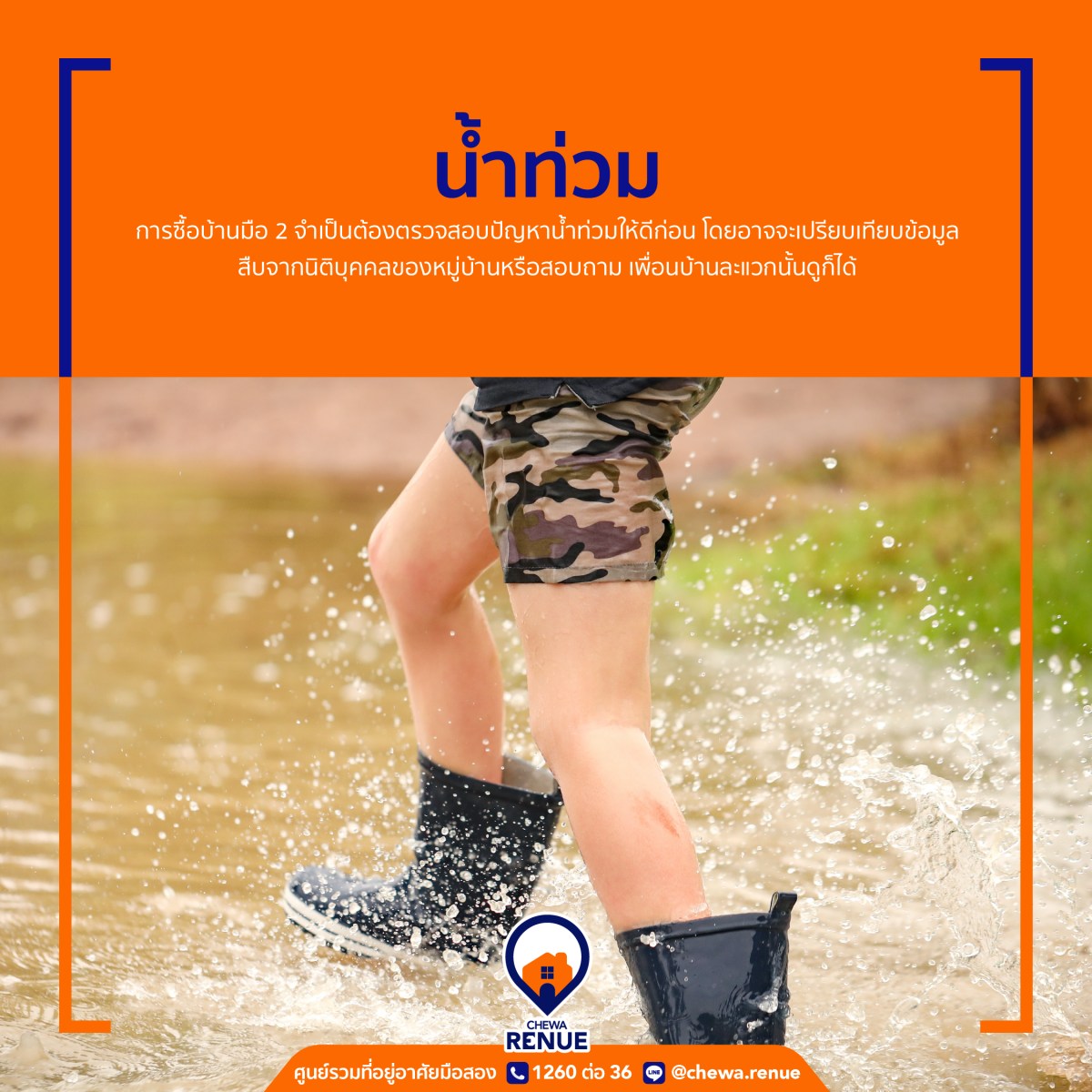 ปัญหาหมู่บ้านน้ำไม่ท่วม เคยถูกหยิบยกมาเป็นจุดขายของโครงการ ในช่วงหลังปี 54 – 55 ซึ่งในปัจจุบันโครงการใหม่ ๆ ส่วนใหญ่จะมีการปรับพื้นของโครงการยกสูงจากระดับพื้นถนน เพื่อหนีน้ำ เข้าโครงการไว้ในระดับหนึ่งแล้ว แต่บ้านมือ 2 อีกหลายโครงการอาจยังจำเป็นต้องตรวจสอบให้ดีก่อน โดยอาจะเปรียบเทียบข้อมูล หรือสืบได้จาก นิติ ของหมู่บ้าน หรือสอบถาม เพื่อนบ้านระแวกนั้นดูแทนก็ได้