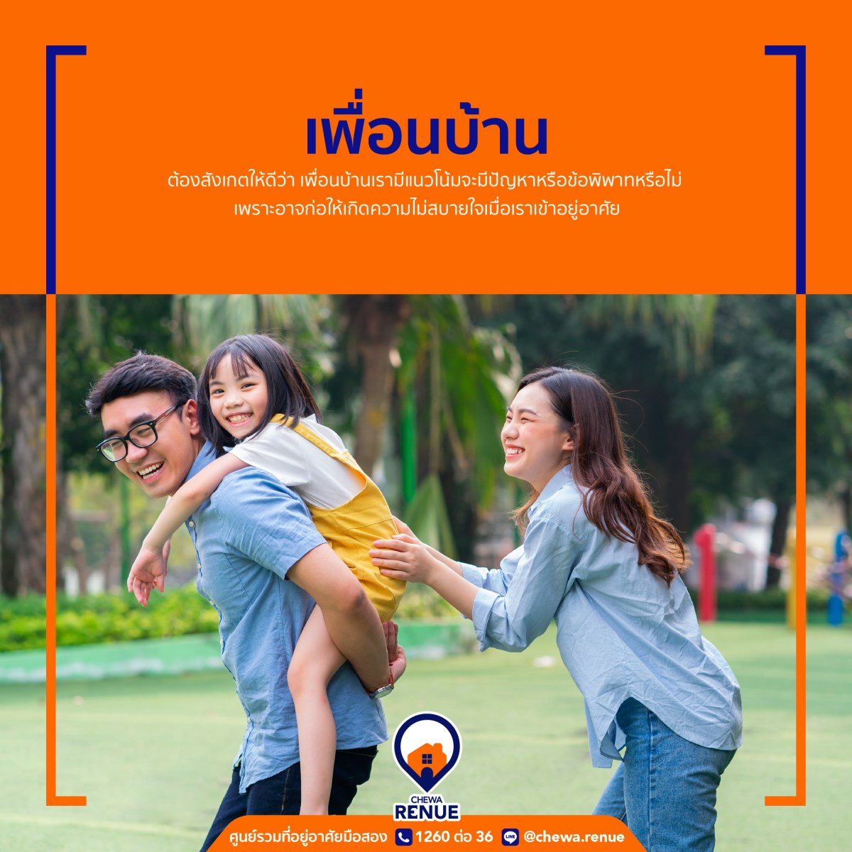 ต่อให้บ้านสวย น่าอยู่เพียงใด แต่อย่าลืมว่าเราไม่ได้อยู่คนเดียว แล้วยิ่งการซื้อบ้านมือ 2 คือเป็นการที่เราไปอยู่ในระแวกที่มีคนอยู่ก่อนแล้ว ก็จะมีทั้งข้อดีข้อเสีย ดังนั้นต้องสังเกตุให้ดีว่า เพื่อนบ้านเรามีแนวโน้มจะมีปัญหา หรือข้อพิพาท กันไหม ต้นไม้บ้านอื่น ล้ำเลยมาบ้านเราหรือเปล่า สภาพข้างบ้านรกไหม มีเลี้ยงสัตว์ หรือส่งเสียงดัง จะเกิดความไม่สบายใจตอนเราอยู่หรือไม่ หากมี แล้วพอหาทางรับมือได้ก็ไม่มีปัญหา แต่ถ้ามีแล้วไม่รู้จะแก้ยังไง ต่อให้บ้านสวย หรือดีแค่ไหน แต่ตอนอยู่จริงแล้วไม่สบายใจ ก็จะลำบากได้