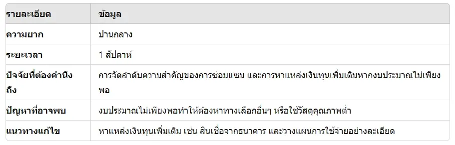 - การจัดลำดับความสำคัญ: เน้นซ่อมแซมส่วนที่สำคัญก่อน เช่น โครงสร้างและหลังคา