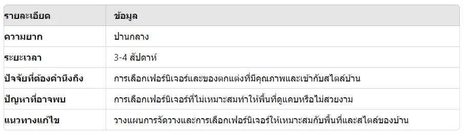 - การเลือกเฟอร์นิเจอร์: เลือกเฟอร์นิเจอร์ที่มีขนาดเหมาะสมกับพื้นที่และสไตล์ที่ต้องการ
